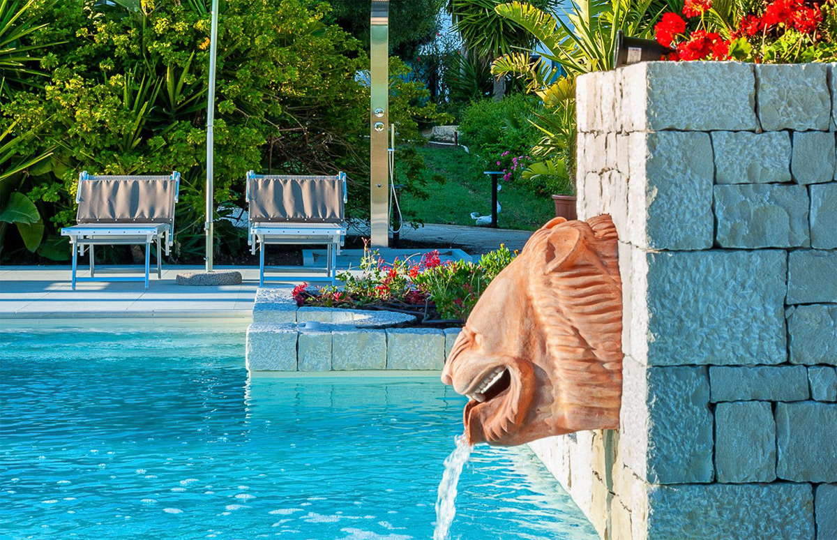 La bella piscina sul prato antistante include anche un bacino con idromassaggi;